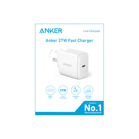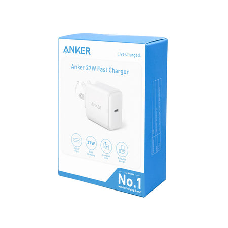 Dual‑port wall charger with 1× USB‑C and 1× USB‑A outputs; total up to 27W.
