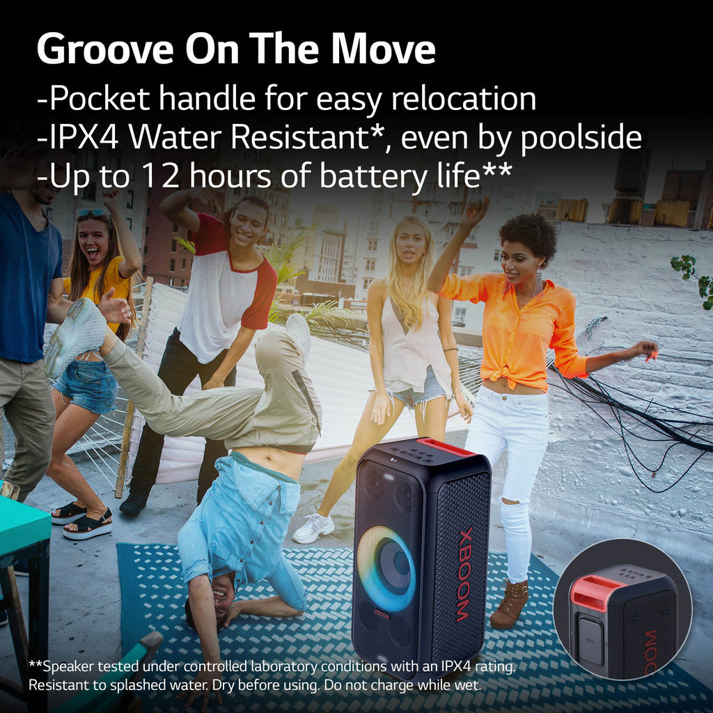 Feel and hear the beat with bumped-up bass thanks to 200 Watts and a 6" full range woofer. Customize your very own lighting and party atmosphere while enjoying music on the go. A pocket handle keeps the groove on the move, making it easy and convenient to enjoy music anywhere. Keep the party pumping even by the poolside thanks to its IPX4 water resistant rating.