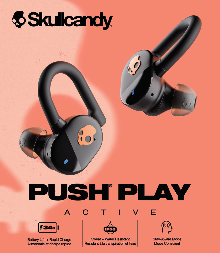 Push Play Active is built for any active lifestyle, any weather and any condition. It shrugs off sweat, water, and even dust and dirt. Secure, low-profile ear hangers keep your buds comfortably in place, no matter how hard you play, and 34 hours of play time means Push Play Active won’t quit until you do.