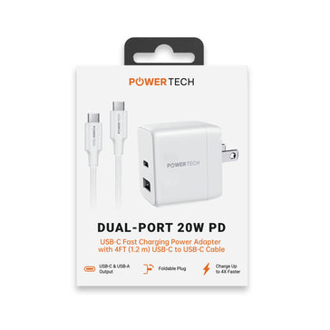 Powertech PD 20W Dual-Port USB-A & USB-C Wall Charger W/ 4ft C-C Cable - Black