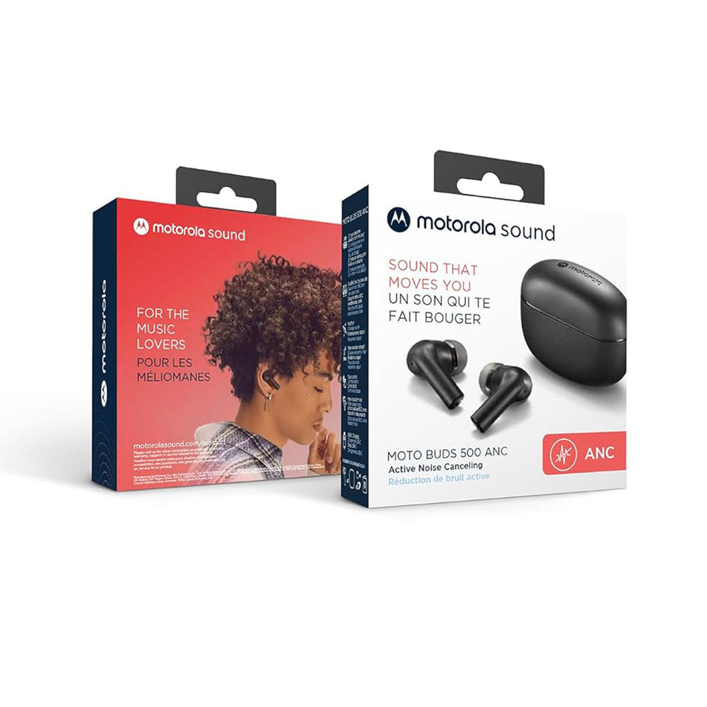 Introducing the MOTO BUDS 500 ANC! Get up to 20 hours of music and calls with these wireless earbuds. They block out noise so you can enjoy your music, and they're super easy to control with a tap or your finger. Plus IPX4 rating, they're sweat and splash-proof, so you're covered in the rain or during workouts. Enjoy perfect sound all day long!