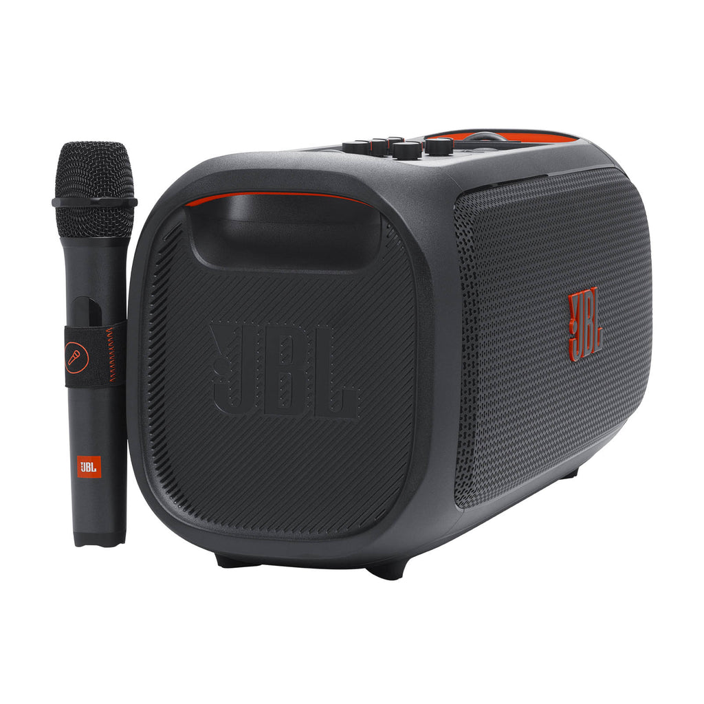 From beach parties to festivals, the JBL PartyBox On-The-Go Essential lets you see, hear and feel the beat. Turn it up loud with 100 watts of powerful JBL Pro Sound, synched to a dazzling light show. Access your favorite tunes with Bluetooth, USB, AUX and TWS (True Wireless Stereo) connectivity, grab a friend and sing your hearts out with the JBL wireless mics, or use the guitar input to play along. With a bottle opener, padded shoulder strap, rechargeable battery and IPX4 splashproof protection, the JBL PartyBox On-The-Go Essential has everything you need to get the party started—and take it with you.