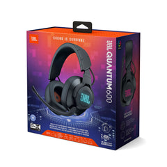 Designed for immersion and performance, the JBL Quantum 600 2.4GHz wireless gaming headset gives you a clear edge over the competition with accurate and immersive sound. JBL QuantumSURROUND‚Ñ¢ sound replicates a wider, more realistic spatial environment on your PC, so you never miss a detail. The voice focus boom mic enables clear communication with other players, while a DISCORD-certified game audio-chat balance dial allows you to easily balance chat and game audio levels. Leather-wrapped, memory foam ear cushions keep you comfortable, while a 14-hour (max) battery life enables cord-free, long-lasting gaming sessions. Dominate your opponents and gain a clear audio advantage with JBL Quantum 600 headset.