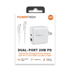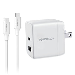 Powertech 20W PD Dual-Port USB-A & USB-C Wall Charger W/ 4' C-C Cable - White