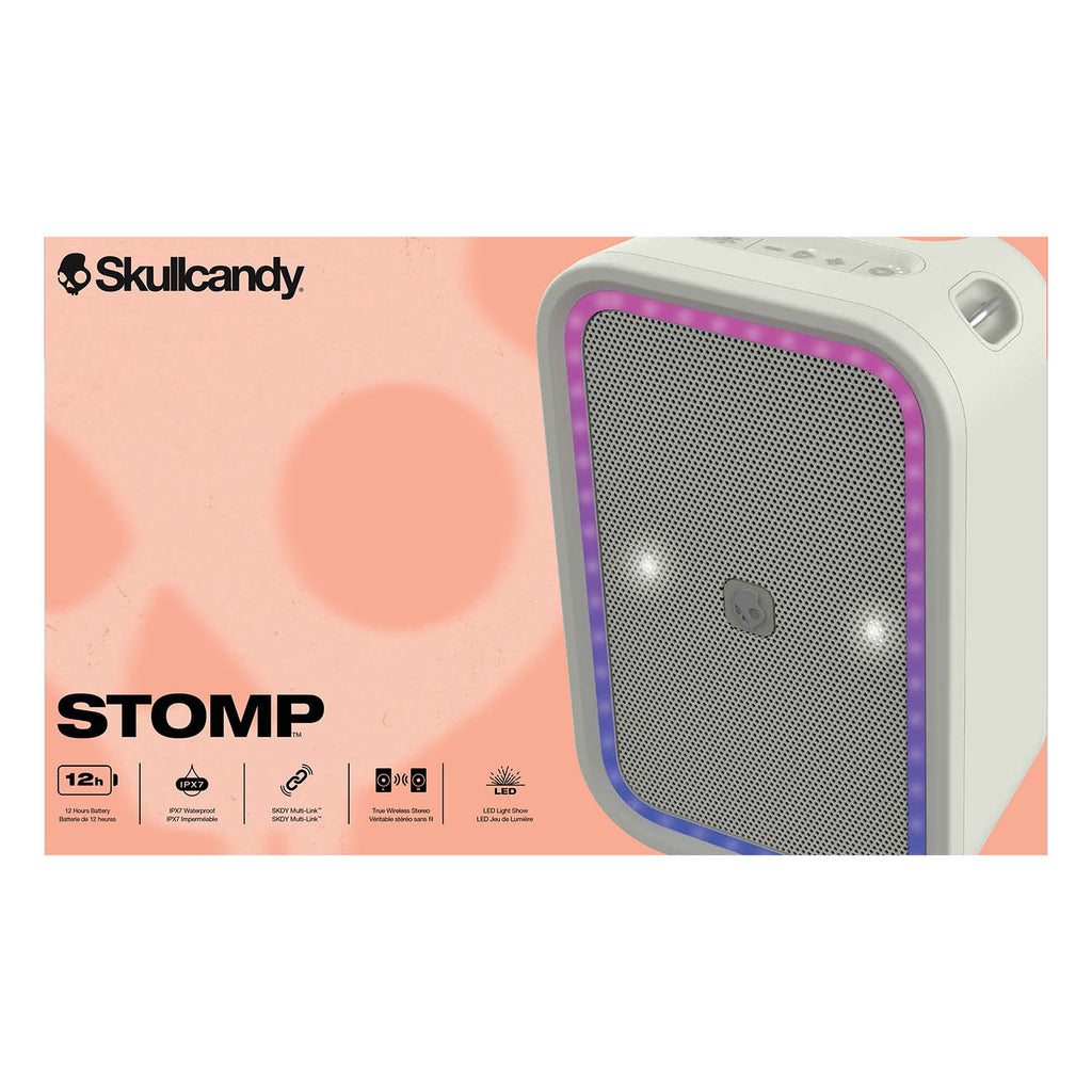 Most portable speakers leave you wishing for more. Not Stomp. This is a full-frequency speaker with beautiful, bright highs, rich mids and deep, punchy bass. Stomp packs enough punch to handle a house party on its own, but it adds the convenience of total portability, water-resistant construction, the ability to link to up to 99 more Skullcandy wireless speakers and an LED light show.More from this collection